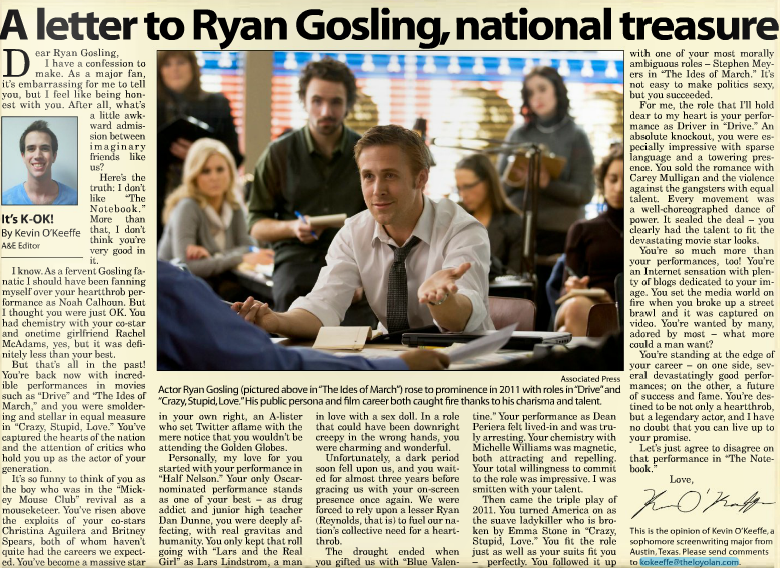 Revisiting: Admittedly, if I had to rewrite this piece, I would have put it out in October, in the heat of Ryan’s success. With the delay of his movie Gangster Squad to 2013, this year will go without a major Gosling release, and the spotlight has been shifted to fellow Emma Stone co-star Andrew Garfield for his work in The Amazing Spider-Man. Still, I’m firmly in Ryan’s corner — he’ll be back soon enough, and in a big way. I’m just glad I got to declare my love in such a creative, fun fashion.